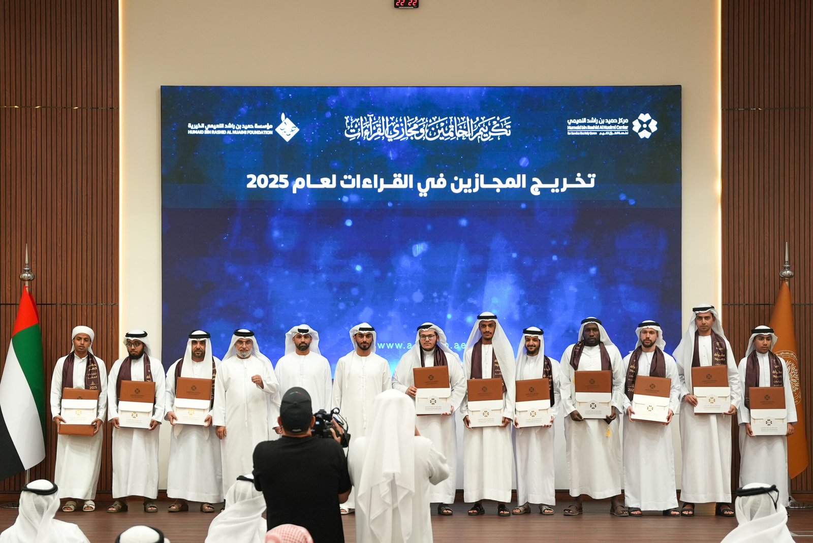 كرّم مركز حميد بن راشد النعيمي لخدمة القرآن الكريم، مساء أمس، خريجي دفعة العام 2025 من خاتمي القرآن الكريم ومجازي القراءات العشر، بحضور الشيخ عبدالله بن أحمد بن حميد النعيمي.