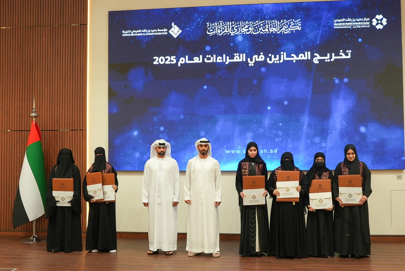 وشهد الحفل عرضا لفيلم تناول إنجازات مركز حميد بن راشد النعيمي لخدمة القرآن الكريم خلال العام 2025، ومنها تخريج 43 خاتما وخاتمة للقرآن الكريم، منهم 13 من الذكور و30 من الإناث، أتموا حفظ كتاب الله عبر منظومة تعليمية متكاملة شملت حلقات مساجد تلقى فيها 1142 طالبا وطالبة القرآن في أجواء عامرة بالسكينة، كما أسهمت حلقات التعليم عن بعد في توسيع دائرة الاستفادة لتشمل جميع إمارات الدولة استفاد منها 729 طالبا وطالبة عبر منصة تعليمية متخصصة.